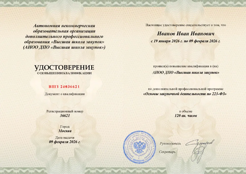 Вы получаете официальное удостоверение о повышении квалификации. Высшая школа закупок (fz44.org) в обязательном порядке вносит сведения об обучении в Санкт-Петербурге в реестр ФИС ФРДО, подтверждая легитимность вашей подготовки перед контролерами.