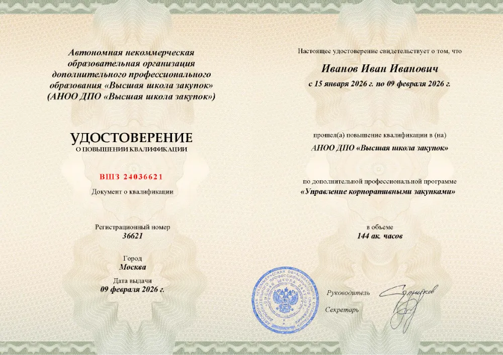 Вы получаете официальный документ о повышении квалификации. Высшая школа закупок (fz44.org) в обязательном порядке вносит сведения об обучении в Санкт-Петербурге в реестр ФИС ФРДО, подтверждая легитимность вашей подготовки перед контролерами.